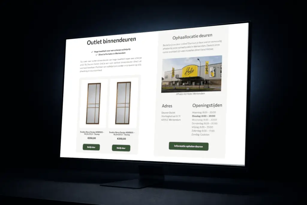 Voor DeurenOutlet hebben wij een complete webshop ontwikkeld met een duidelijke focus op gebruiksvriendelijkheid en conversie. De structuur is logisch opgebouwd, zodat bezoekers snel het juiste type deur kunnen vinden en eenvoudig kunnen navigeren tussen categorieën, filters en productpagina’s.